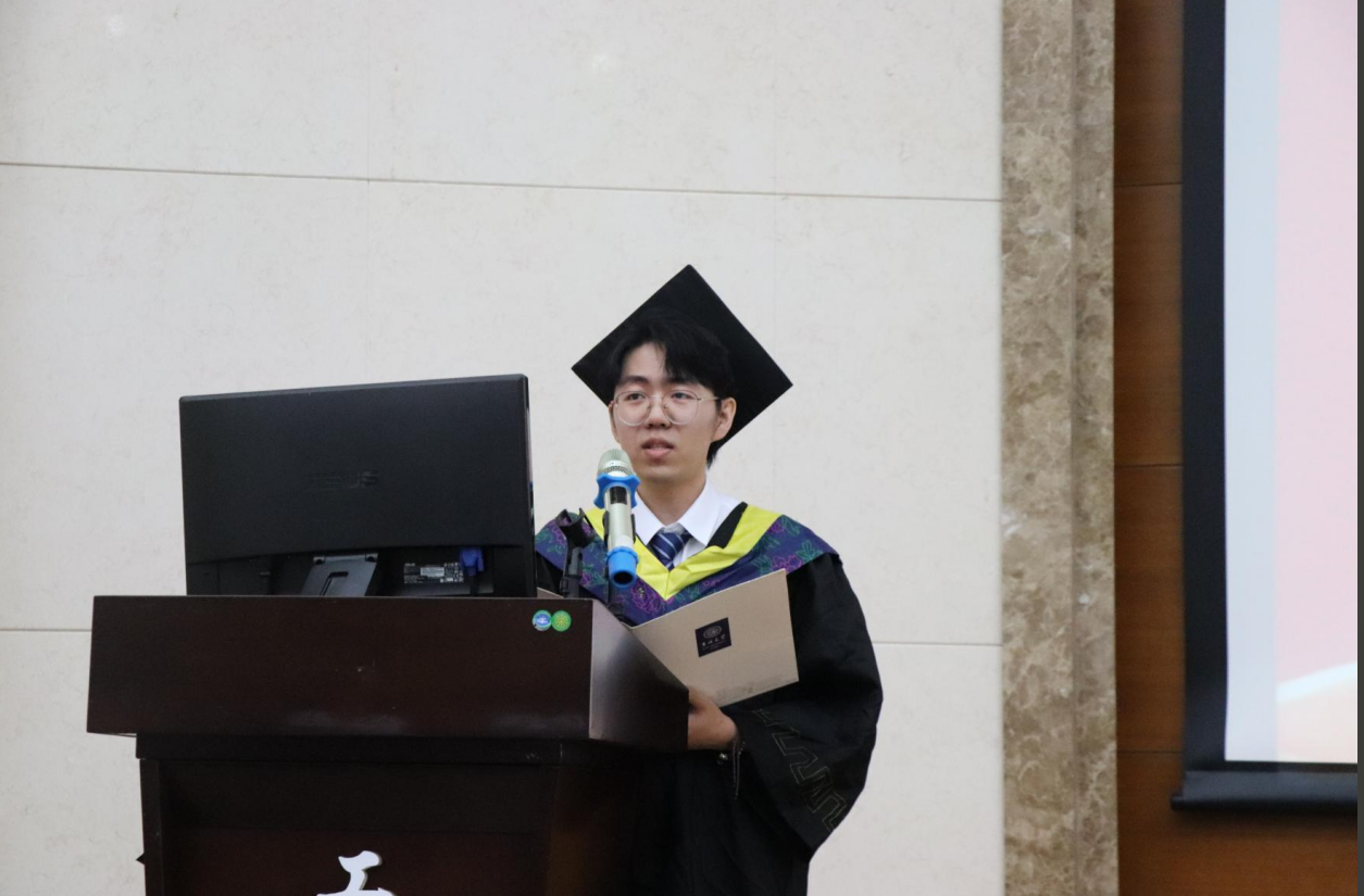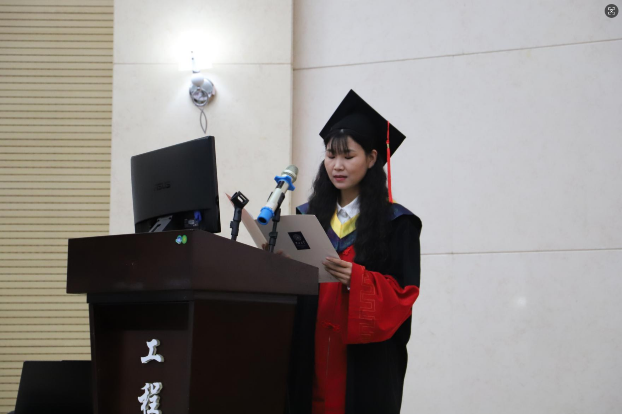在毕业生代表发言环节,本科毕业生代表农业机械化及其自动化专业郭晓鹏同学和毕业研究生代表仿生科学与工程专业李玉敏同学先后上台。郭晓鹏回顾了本科四年在校园里的点点滴滴,并分享了自己在学习生活中的成长与收获,表达了对母校、老师和同学们的深深感激之情,激励同学们勇敢追逐梦想。李玉敏讲述了在研究生阶段面对困难与挑战时的坚持与突破,鼓励大家在未来的道路上不断探索,为学术事业贡献自己的力量。