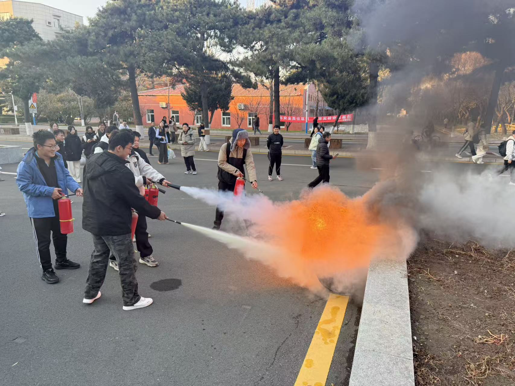在培训后的疏散演练过程中,仿生楼内师生沿着疏散通道迅速、有序撤离到安全地带。随后,东区保卫办公室的老师模拟真实火情,为同学们演示并教授了各类型灭火器的使用方法和注意事项,并指导同学现场实际操作。