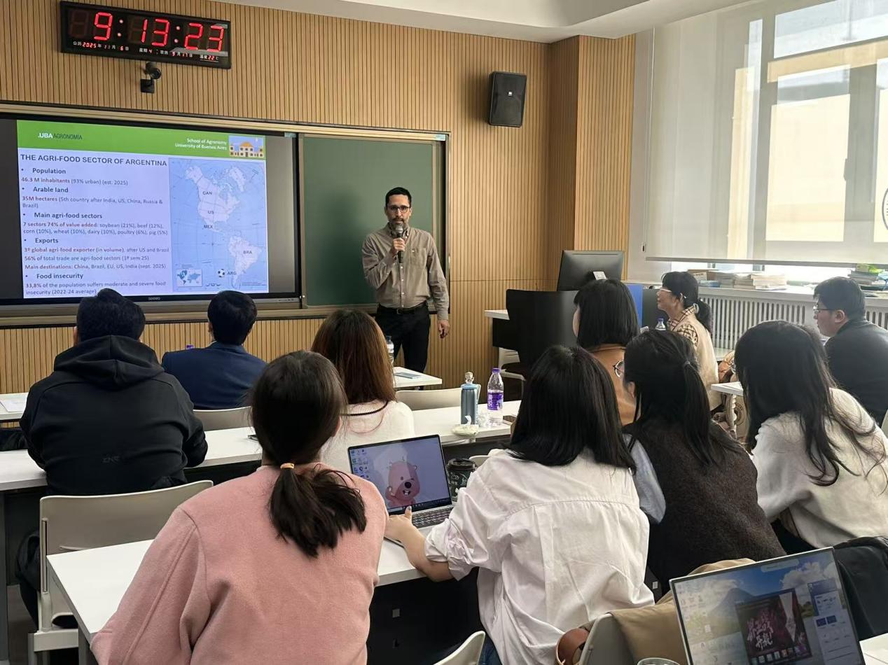 在同期举办的“国际农业经济与食品经济教育研讨会”及“中阿农业经济与食品经济研讨会”上,华金教授围绕“拉丁美洲城市食品体系”进行了专题分享,新西兰林肯大学丛蕾博士就“消费者导向型食品创新与开发”展开深入交流,与会师生聚焦城市食品体系的跨文化比较与治理创新,围绕城市粮食供应战略、中国和阿根廷食品供应中的物流和商业互动、生态友好型食品生产与获取等相关内容进行了交流研讨。