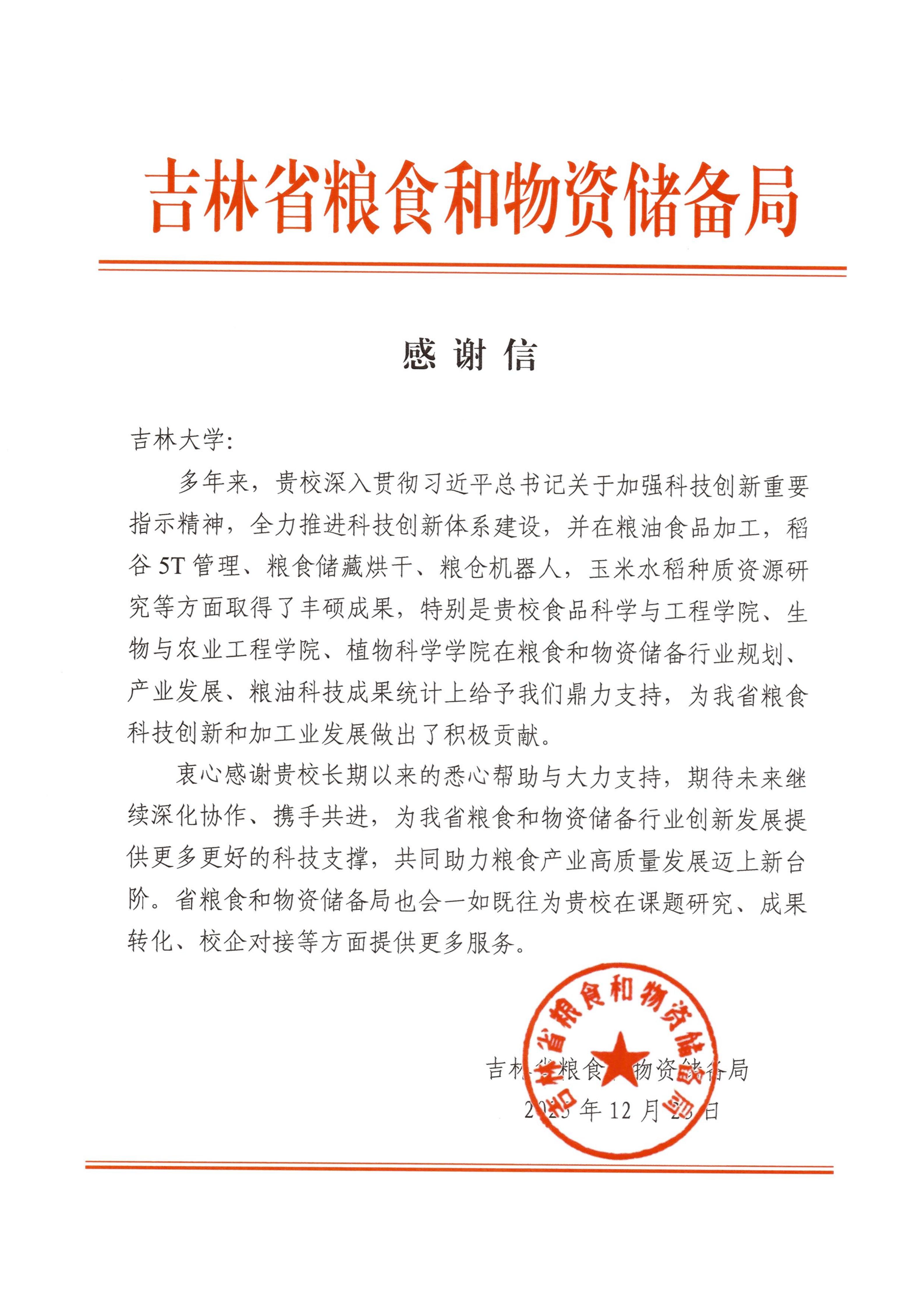 近日,吉林省粮食和物资储备局向beat365在线体育官网发来感谢信,专门肯定了beat365在线体育官网在粮食和物资储备领域的科研支撑与服务贡献,信中特别提及学院粮食储运团队在稻谷5T管理、粮食储藏烘干、粮仓机器人等技术研发及行业服务中的关键作用。