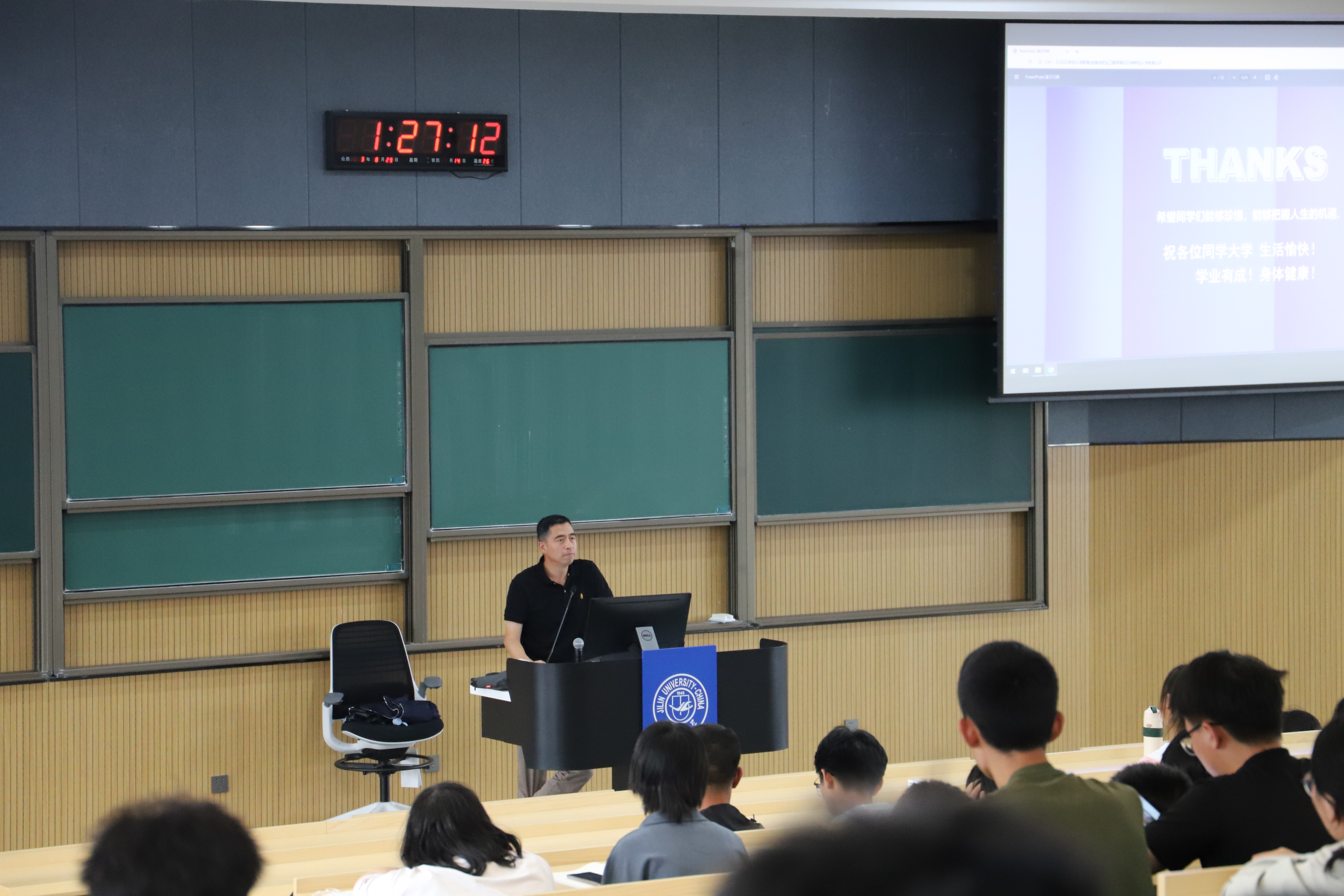 其次,郭院长对大一新同学强调了网络安全问题,希望大家注意防范电信诈骗。他建议大家去电影院观看电影《孤注一掷》,增强网络安全防范意识。他还举了一些自己身边的例子,来提醒大家在上网冲浪的同时,注意网络安全。