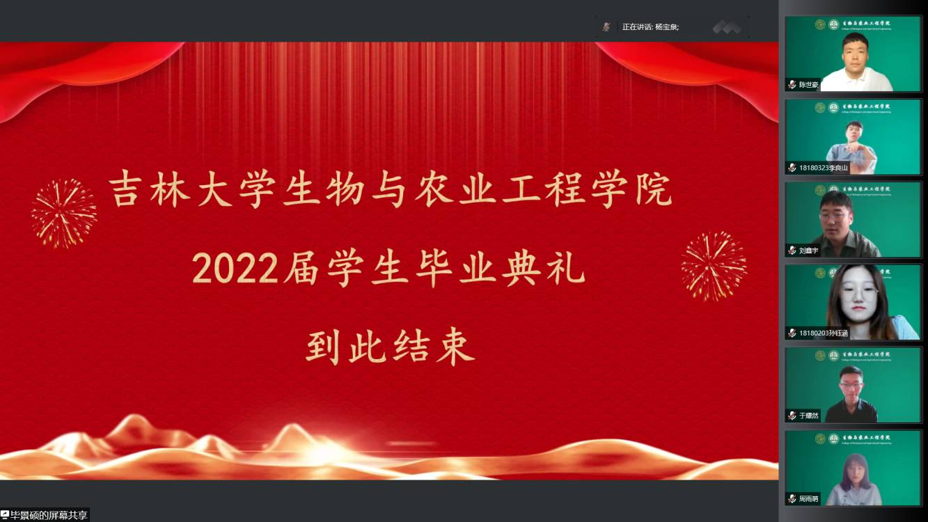 2022年6月18日上午9时,生物与农业工程学院2022届毕业典礼在线上召开。院系领导班子成员、学院教职工代表及学院全体2022届本科毕业生和研究生毕业生出席典礼。典礼由生物与农业工程学院党委书记杨宝泉主持。