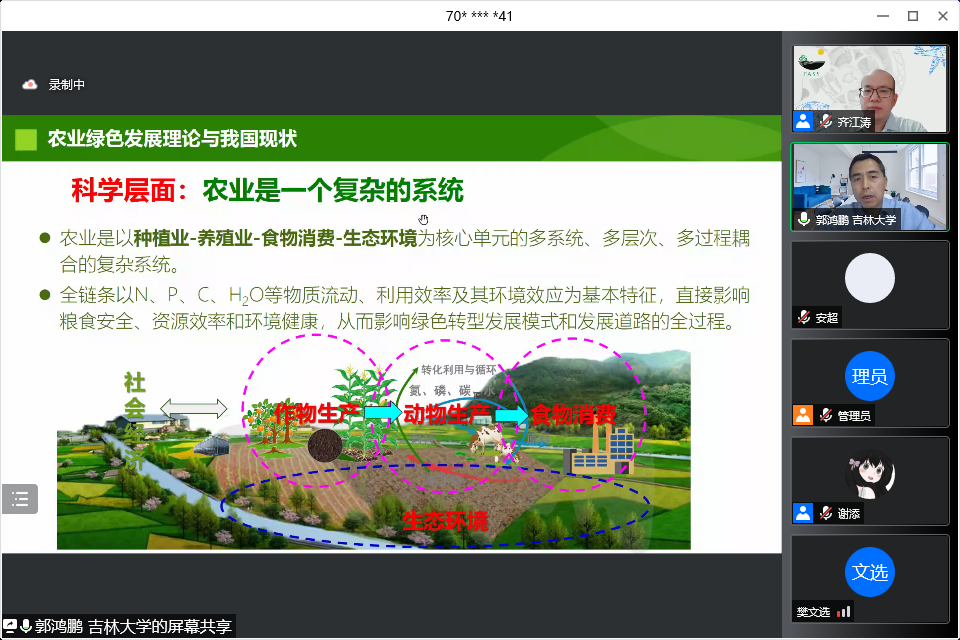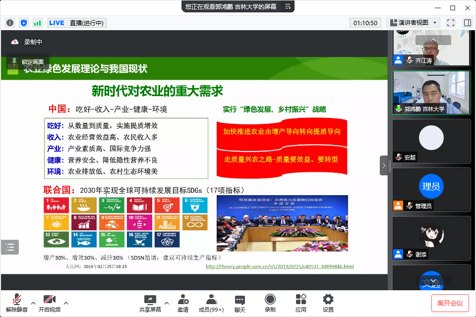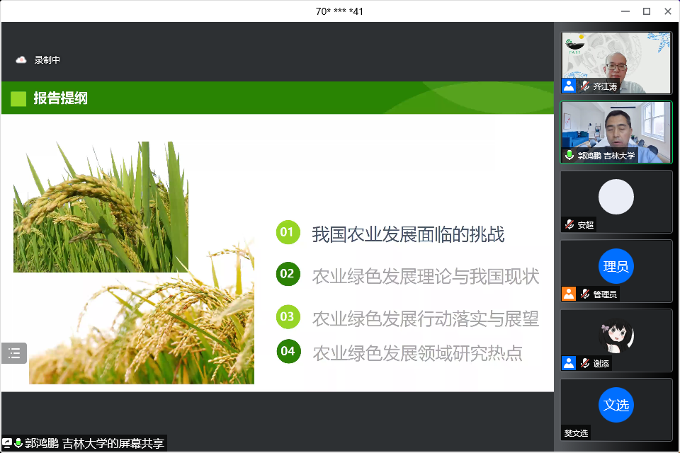 郭鸿鹏教授从我国农业发展面临的挑战、农业绿色发展理论与我国的现状、农业绿色发展行动落实与展望和农业绿色发展领域研究热点四个方面逐一展开报告。