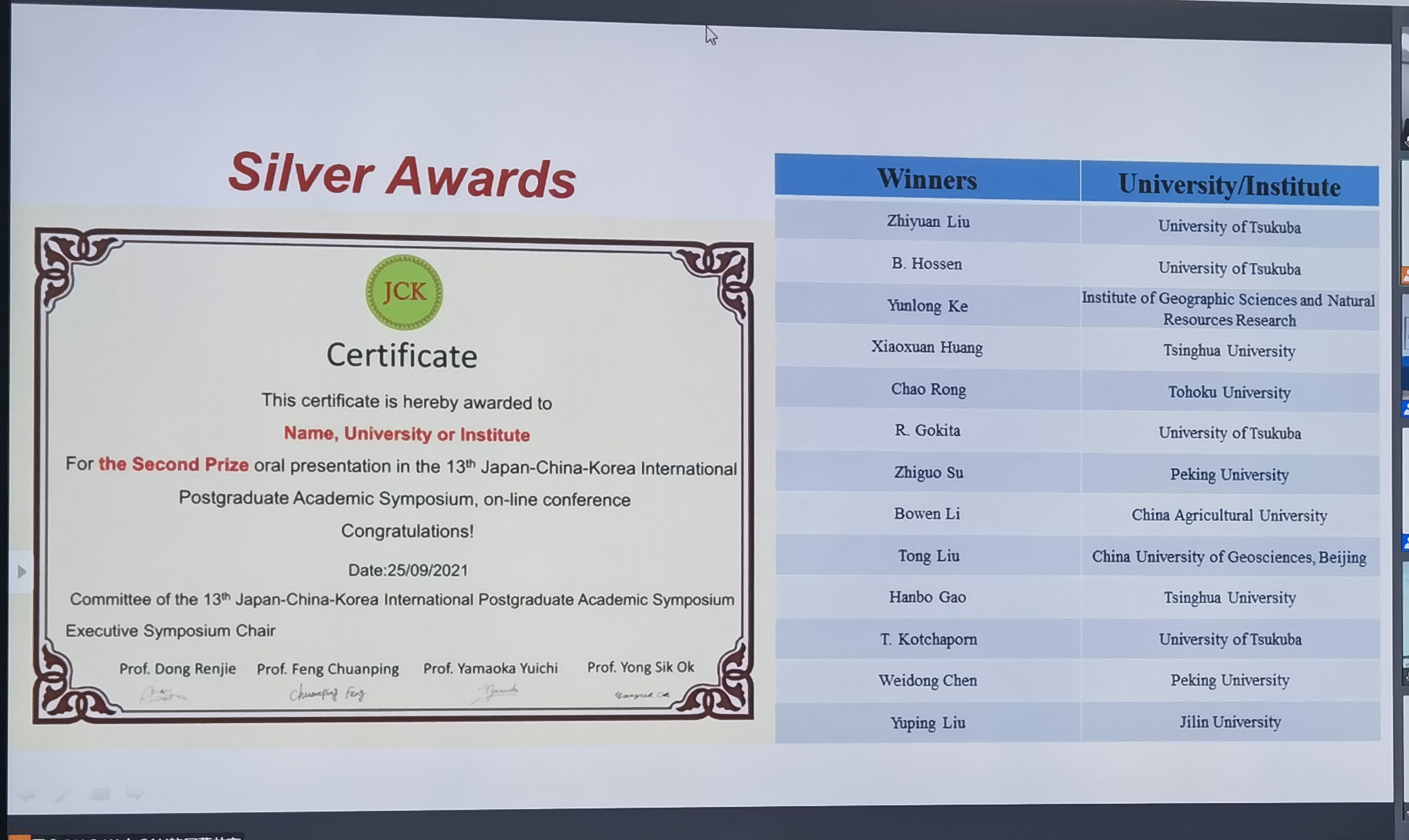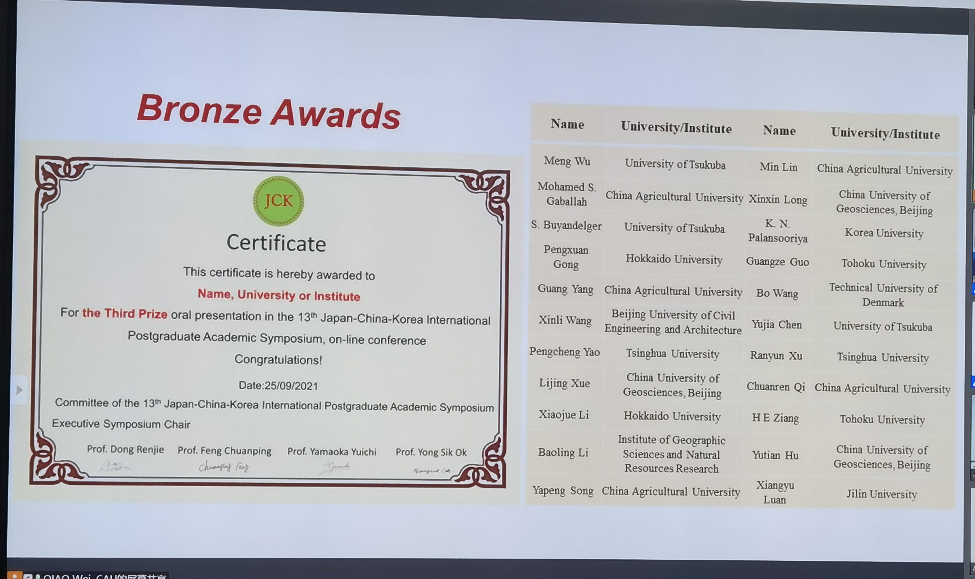 2021年9月24-25日,第13届中-日-韩国际研究生学术论坛顺利闭幕,beat365在线体育官网生物与农业工程学院研究生取得优异成绩。本届论坛由中国农业大学主办,受新冠疫情影响首次采用国际在线方式进行。今年共有来自国内清华大学、北京大学、beat365在线体育官网、中国农业大学、中国地质大学(北京)、中科院地理科学与自然资源研究所以及日本筑波大学、北海道大学、神户大学、东北大学、韩国高丽大学、丹麦科技大学等共计106名研究生和50余名教师参加。