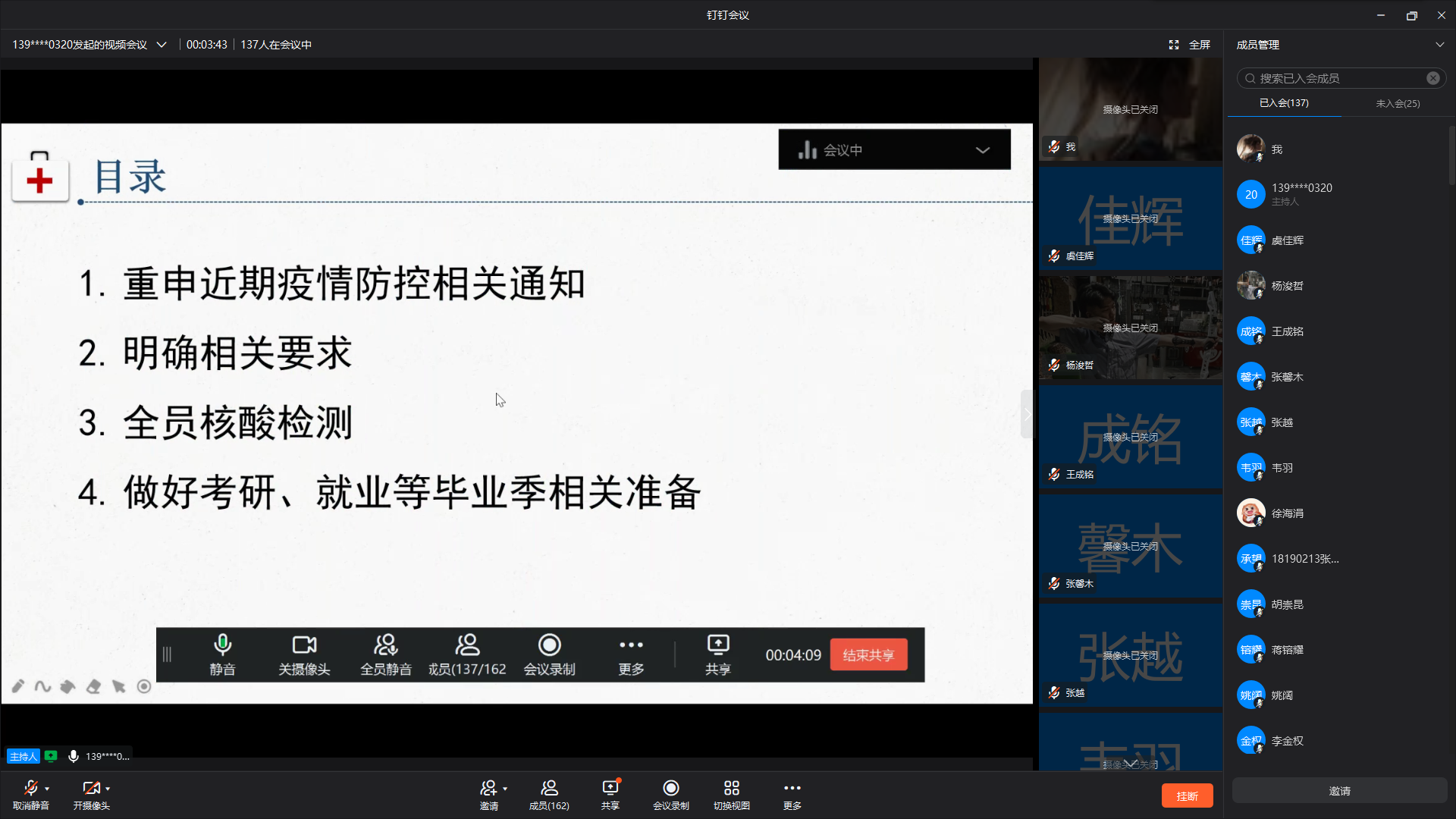 本次会议中辅导员着重强调了本次疫情防控的紧急性和迫切性。毕老师针对下一步疫情防控相关工作做出如下通知和要求:一、学院高度重视本次防控,将持续认真开展排查工作。二、即日起,同学们出入公寓、食堂、图书馆、教室等公共场所或人流密集的室外场所,必须佩戴口罩,不佩戴口罩的,不得进入相关区域。三、同学们要做好每日健康监测及打卡工作,确保打卡率,未打卡学生说明原因。四、如学生出现发热情况,要立即上报导员,按有关流程处理。确保返校学生完成返校后核酸检测,逐一核验结果并确认,"不漏1人"。五、同学们不要在网络发布不真实言论,不传谣,不信谣。六、同学们要做到非必要不离校,非必要不离长。此后,辅导员对同学们的新学期学习生活做出了关照,要求同学们在做好疫情防控的同时尽快适应新学期新生活,做到认真、专注、目标明确。