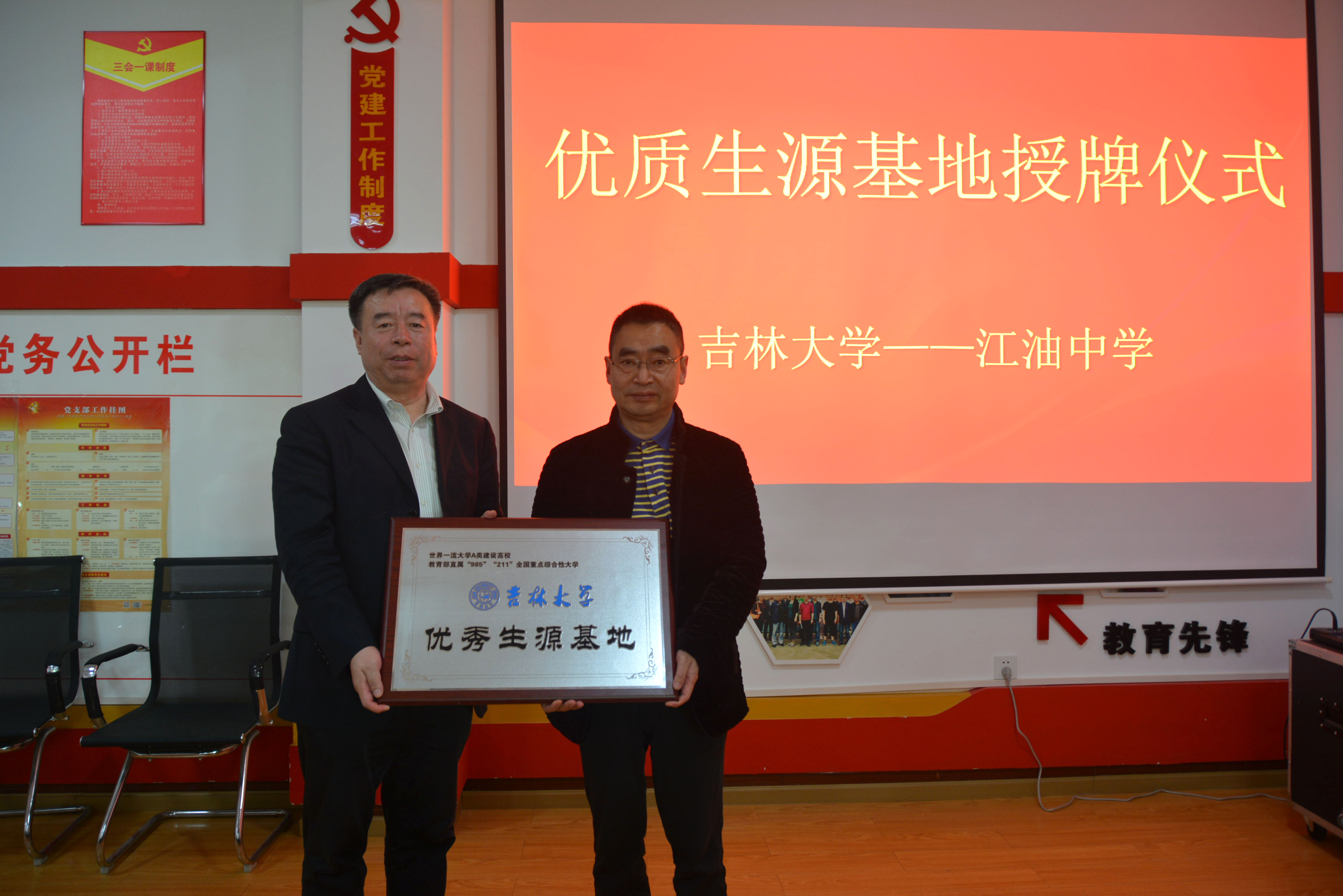 4月8日,杨宝泉书记一行到四川省江油中学进行招生宣传,并举行了“优秀生源基地”授牌仪式。江油中学党委书记、校长勾红蔚,以及江油中学主要中层干部、教师代表和学生300多人参加了本次会议。首先,勾校长和杨书记分别介绍了江油中学和beat365在线体育官网的基本情况。勾校长代表江油中学全体师生对杨宝泉书记一行表示热烈欢迎和衷心感谢,希望两校进一步加强交流与合作,为共同培养更多的高水平人才做出更大贡献。杨书记对江油中学近年来向beat365在线体育官网输送了众多优质生源表示感谢,希望两校以共建“beat365在线体育官网优秀生源基地”为新的起点和契机,深入开展交流合作,期待有更多优秀的江油中学学生报考beat365在线体育官网。杨宝泉书记代表beat365在线体育官网向江油中学授予了“优秀生源基地”牌匾。授牌仪式后,通过观看宣传片《吉大力量》,江油中学的师生进一步加深了对吉大的了解。然后,王刚副教授以“前所未有的农业革命—智慧农业”为题做了一场学术报告,引起了在场师生对智慧农业的极大兴趣,产生了热烈反响。李大伟副教授向与会师生介绍了beat365在线体育官网的历史沿革、办学理念、“双一流”建设、人才培养、校园生活、招生录取等情况,鼓励江油中学的同学们积极报考beat365在线体育官网。
