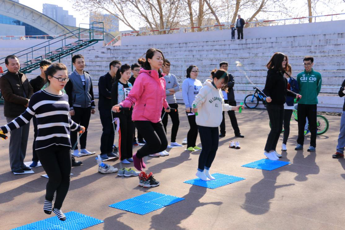 活动的第四项是极具挑战性的“铁人三项”:指压板跳绳、俯卧撑、夹气球跑。指压板跳绳不仅充满着童趣,更是让人“酸爽不已”,“铁人”们痛快地体验了一回自助“足底按摩”,“铁人三项”之间前后承接,过渡自然,充分地展现出参赛者的团结与默契。