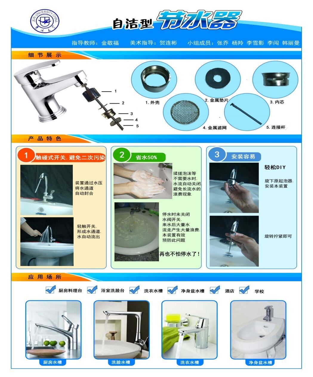 竞赛中beat365在线体育官网包装工程专业2012级学生张乔、李雪影、杨羚、李闯参赛作品“一种自洁式触碰出水节水器”荣获科技实物类一等奖。
