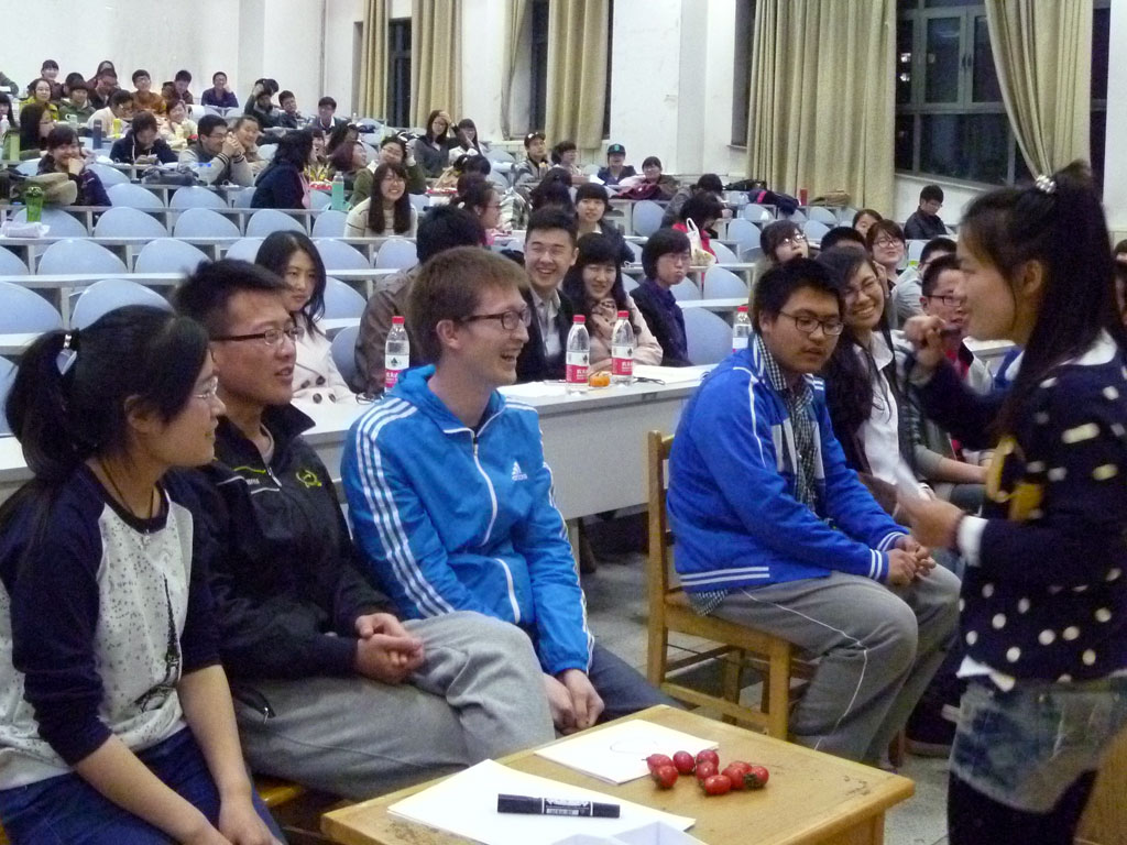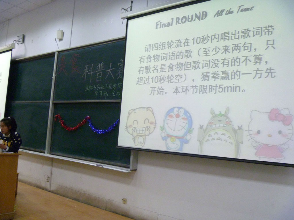 在主持人介绍活动的详细规则后,答题比赛随即拉开序幕。每班派出的两名同学,经过班与班的随机自由组合,八个班的选手被分成四组。一开始,场上的比分便呈现出胶着的状态,四组的实力不分上下,比分相差无几。大赛题目丰富多彩,包含选择题,图片题,歌曲题,场上的选手时常妙语连珠,机智作答,现场气氛十分活跃,场下观众笑声不断,掌声不断。经过六轮答题,D组以全对的骄人战绩独占鳌头,C、B、A组紧随其后。随后进行的是游戏环节,两个品尝美食的游戏得到了场下吃货的踊跃支持,大家的关注度和投入度空前高涨,笑声掌声接连不断。游戏环节结束后,紧张的答题比赛继续进行。此时,题目的难度和多样性都有了大幅提高,如“请在1分钟内说出10种大豆制食物”,“每组选手歌曲接龙,要求歌词里至少包含一种食物”等。经过四轮紧张的比拼,四组选手的分差逐渐拉大。最终,D组以绝对的优势领先,C、B、A组分居二三四名。