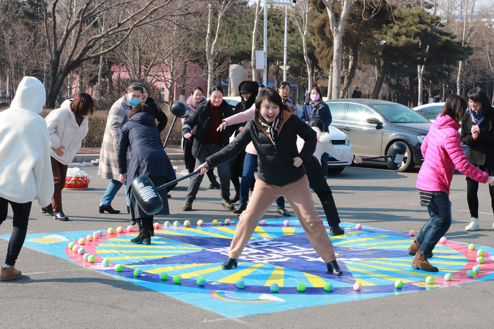 之后,现场女老师们分成两拨,并抽签确定了队名“女神队”“女汉子队”,依次进行了紧张有序的趣味运动会环节:摸石过河、同心击鼓、开心打地鼠、蒙眼互打。在欢闹的气氛中,不仅体现并增强了老师们之间的团队合作能力和顽强拼搏的精神,更加展现了大家的热情洋溢和积极进取的精神风貌,并引来路人驻足和叫好。