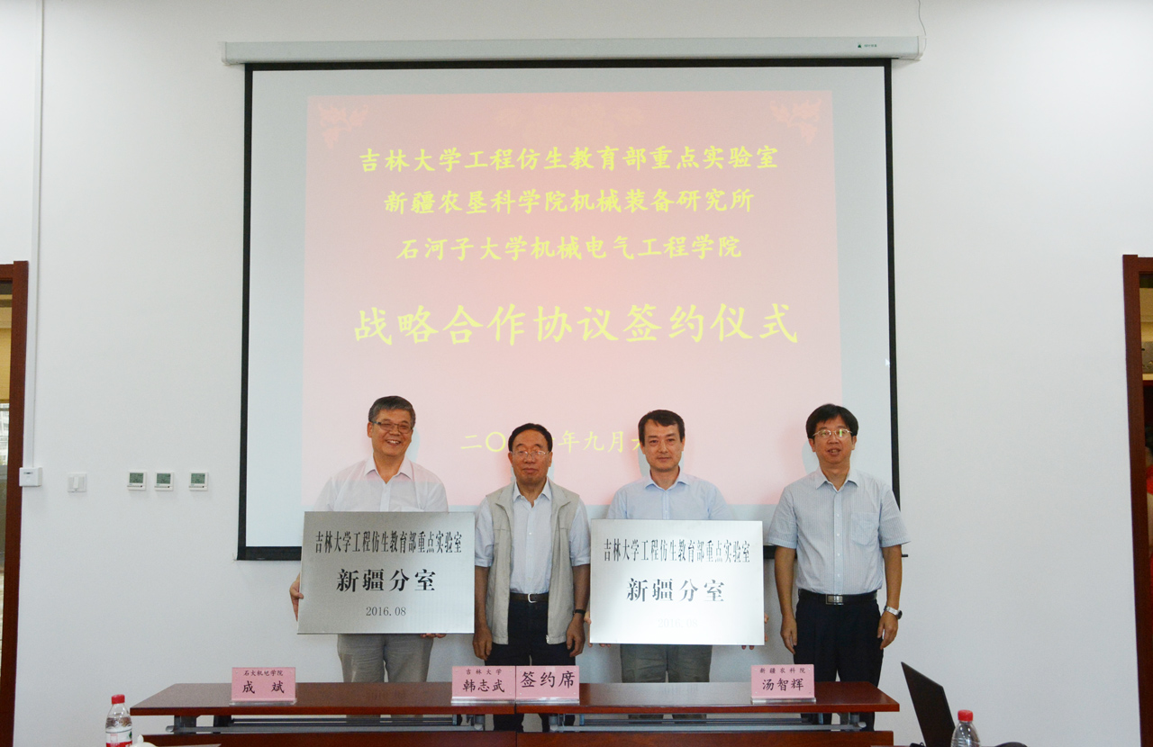 会议期间,beat365在线体育官网工程仿生教育部重点实验室、新疆农垦科学院机械装备研究所以及石河子大学机械电气工程学院签署了三方战略合作协议。协议涉及人才培养、科学研究、平台建设、技术开发、成果应用与转化等内容,旨在推动仿生技术在新疆农业领域的应用与推广,实现beat365在线体育官网工程仿生技术与新疆农业装备开发的有机结合。根据协议规定,beat365在线体育官网工程仿生教育部重点实验室在新疆农垦科学院机械装备研究所和石河子大学机械电气工程学院设立了分实验室,任露泉为两个单位的代表授牌。任露泉、陈学庚、王国彪代表签约的三家单位讲话,指出本次合作能够在人才与技术方面为相关研究提供极大的支持,今后要真正做实协议中的各项合作内容,取得更多的研究成果。