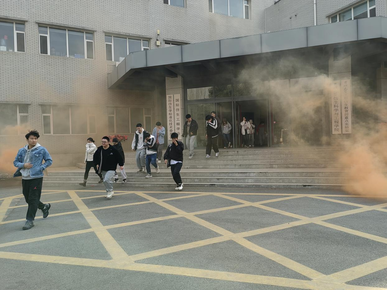 在培训后的疏散演练过程中,仿生楼内师生沿着疏散通道迅速、有序撤离到安全地带。随后,东区保卫办公室消防科的老师模拟真实火情,为同学们演示并教授了灭火毯、灭火器的使用方法和注意事项,并指导同学、老师现场实际操作。