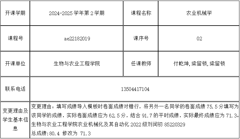 根据《关于进一步明确本科生课程考核等有关问题的通知》(校教字[2018]47号)文件有关精神,现对以下课程成绩更正进行公示: