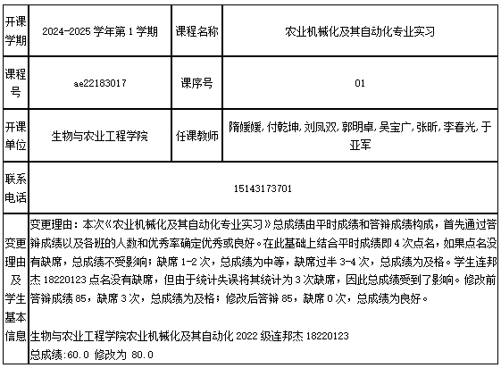关于生物与农业工程学院2022级连邦杰同学农业机械化及其自动化专业实习课程成绩更正的公示