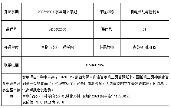 关于生物与农业工程学院2021级王宗宇同学机电传动与控制B课程成绩更正的公示
