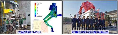 开展大型仿生足式运动平台、工程机械等特种车辆的设计研发工作,服务国防,并多次赴西藏、内蒙等地区开展现场实验。参与国庆70周年阅兵吉林省彩车结构设计与结构应力现场监测保障工作。
