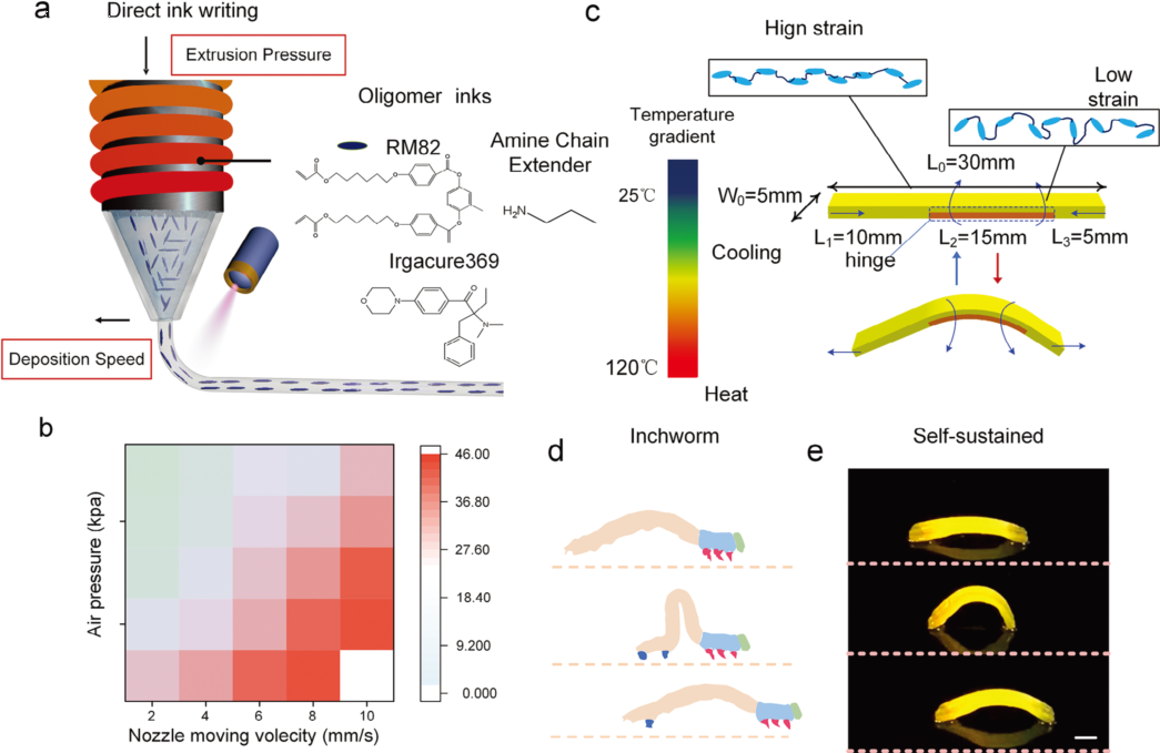 以动植物智能为设计灵感,以液晶基聚合物、水凝胶、形状记忆聚合物、形状记忆合金等智能材料为材料基础,以自主开发的异质多相材料 3D 打印、梯度材料3D打印、工艺参数编程直写式 4D 打印、磁场/流场/电场诱导3D 打印等仿生3D/4D打印为技术支撑,用于智能仿生结构材料和智能仿生驱动材料的制备。耦合智能材料特性定制、打印工艺参数编程和结构设计参数优化的方法,实现仿生材料在自适应隔振吸能机构和智能柔性机器人的实际应用。