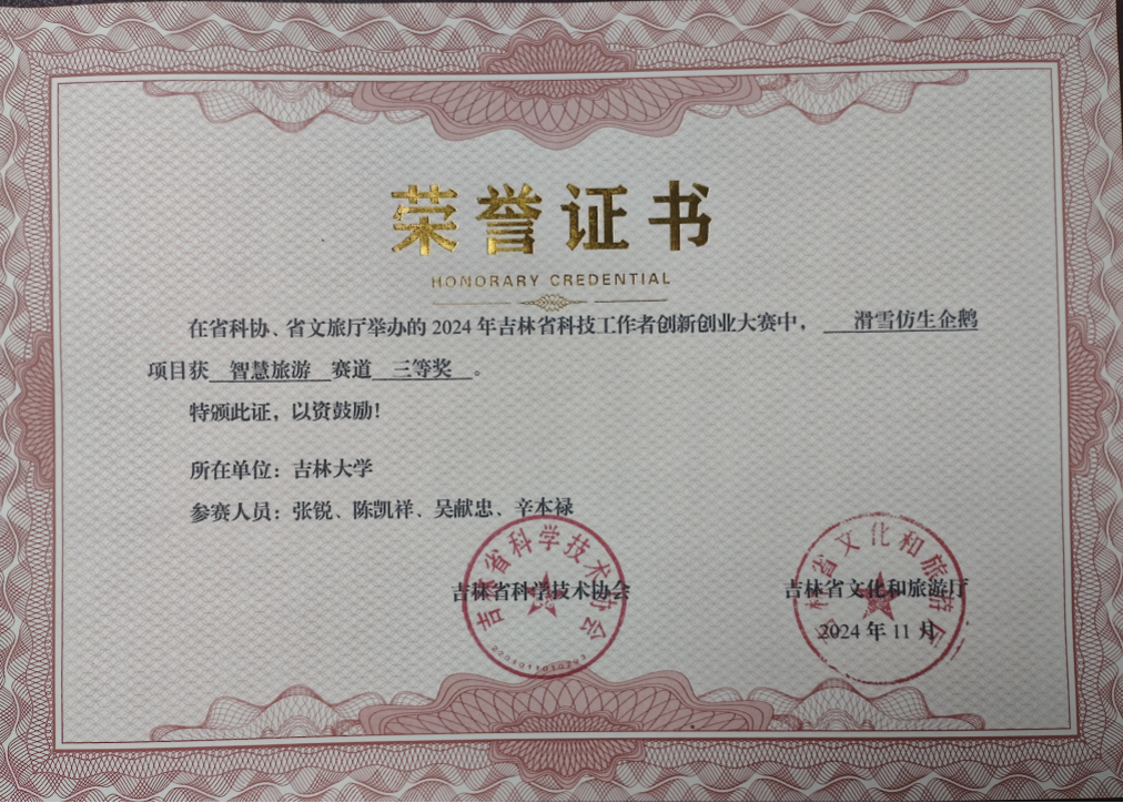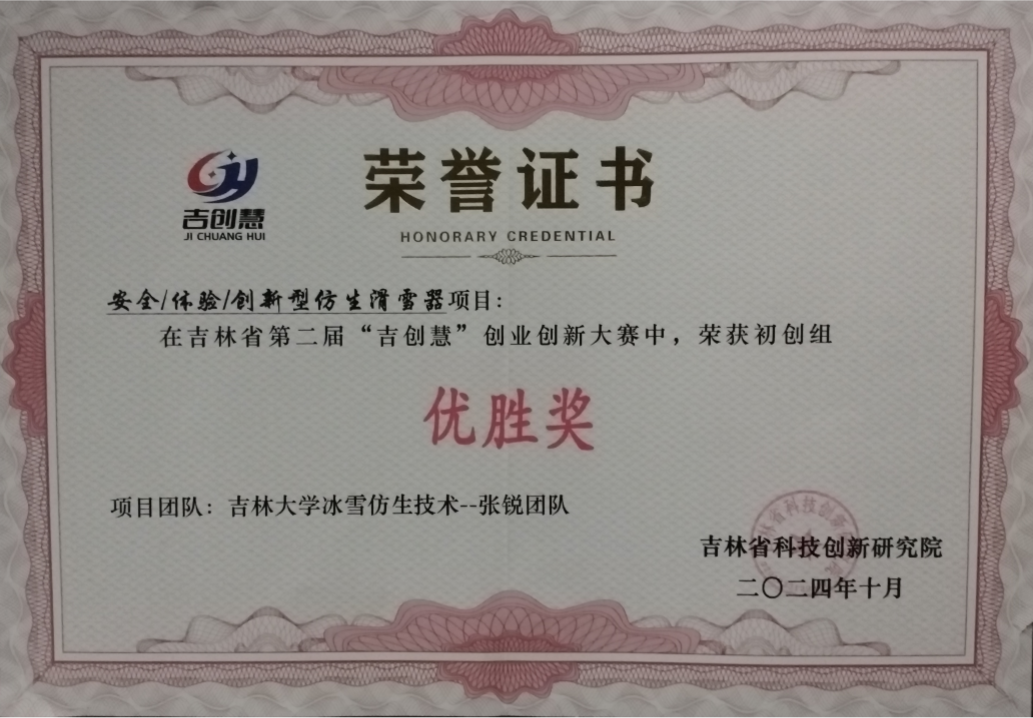 滑雪仿生企鹅装备在创新与技术研发方面表现突出,荣获吉林省科技工作者创新创业大赛智慧旅游赛道叁等奖、吉林省第二届“吉创慧”创新创业大赛初创组优胜奖,充分展示了其技术优势与市场潜力。