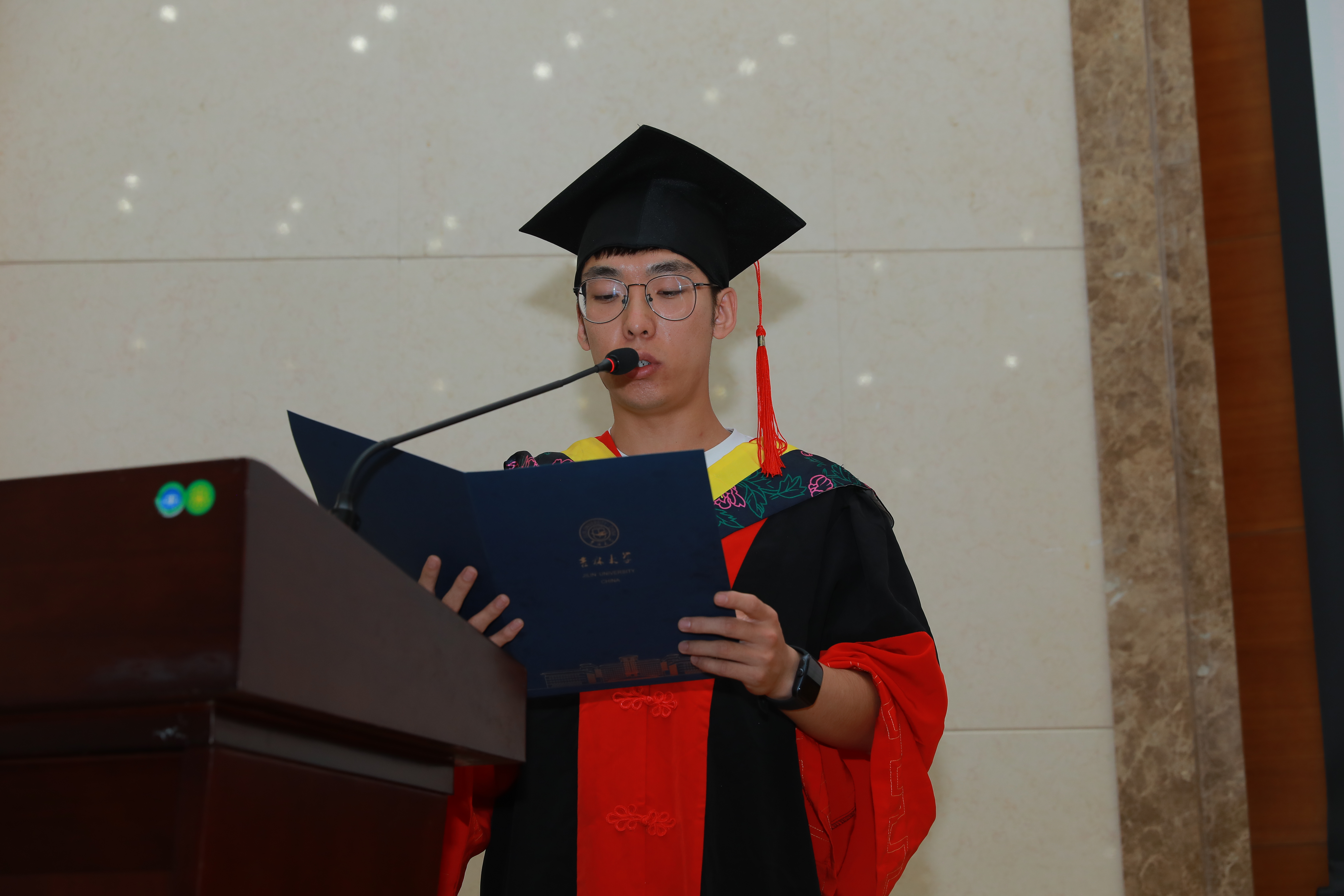 在毕业生代表发言环节,本科毕业生代表徐安彤和研究生毕业生代表宋文达表达了对母校培养教育的感恩之情与惜别之意,展现了当代青年人的只争朝夕、不负韶华的蓬勃朝气,表达了学以致用、奉献科学研究与社会事业的坚定决心。