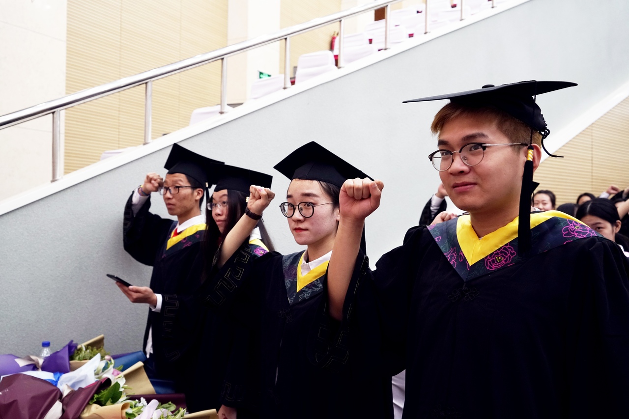 在告别母校,踏上新的征程之际,全体毕业生举起右拳,面向国旗,庄严宣誓。庄重的誓词中,凝结着他们的郑重承诺:铭记母校校训,传承大学文化,争创一流,兼济天下!
