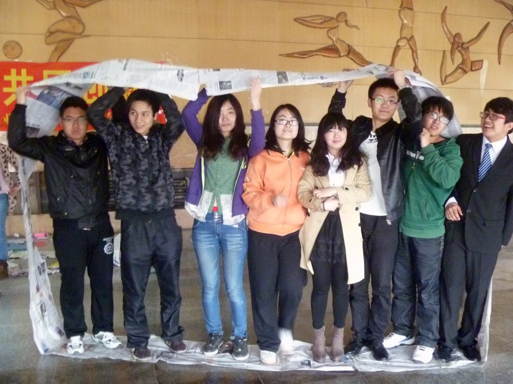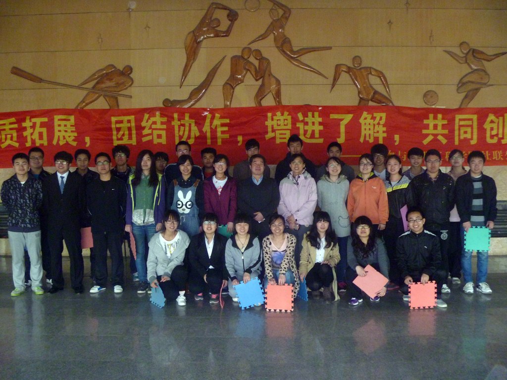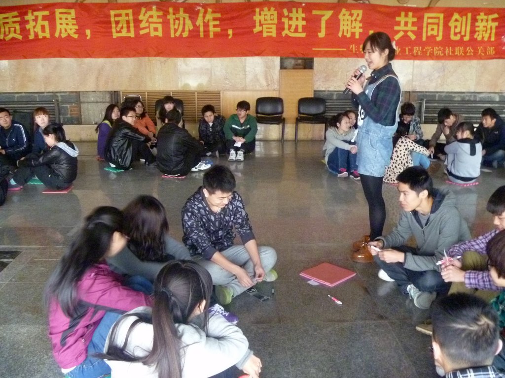 活动开始,车老师用幽默诙谐的方式向大家分享了他曾经带领学生从吉林徒步到长春的经历,告诉大家什么是坚持。而后同学们围成一个圆,开始了手圈手指的游戏,游戏旨在帮助大家集中注意力,并训练大家的反应能力。在手圈手指的游戏结束后,同学们被分为四组,以小组为单位开展团体游戏。小组PK的方式不仅能帮助培养大家的团队合作能力,也让原本并不熟识的副部们因小组活动而畅所欲言、热络起来。在游戏过程中车老师引导大家思考并分享在游戏中的体验,还组织同学们进行了一次心理游戏,这个游戏反映的是人内心的一种期望,在远离社会喧嚣回归最本真的内心深处,我们希望生活是怎样的状态,忙碌或平静。通过这个小游戏,同学们可以更深入的认识自己和了解他人。活动中最精彩的游戏非“无敌风火轮”莫属,作为压轴,这个游戏极大的激发了同学们的参与热情,由制作到练习前进,无一不体现着合作的重要性。游戏过后,同学们通过集体讨论总结后得出结论:一个团队,在完成一件事情的过程中,操作迅速很重要,而事先进行交流确定方案能够事半功倍。12点,活动在大家的掌声中圆满结束。