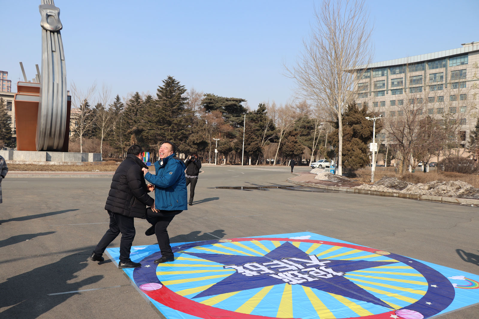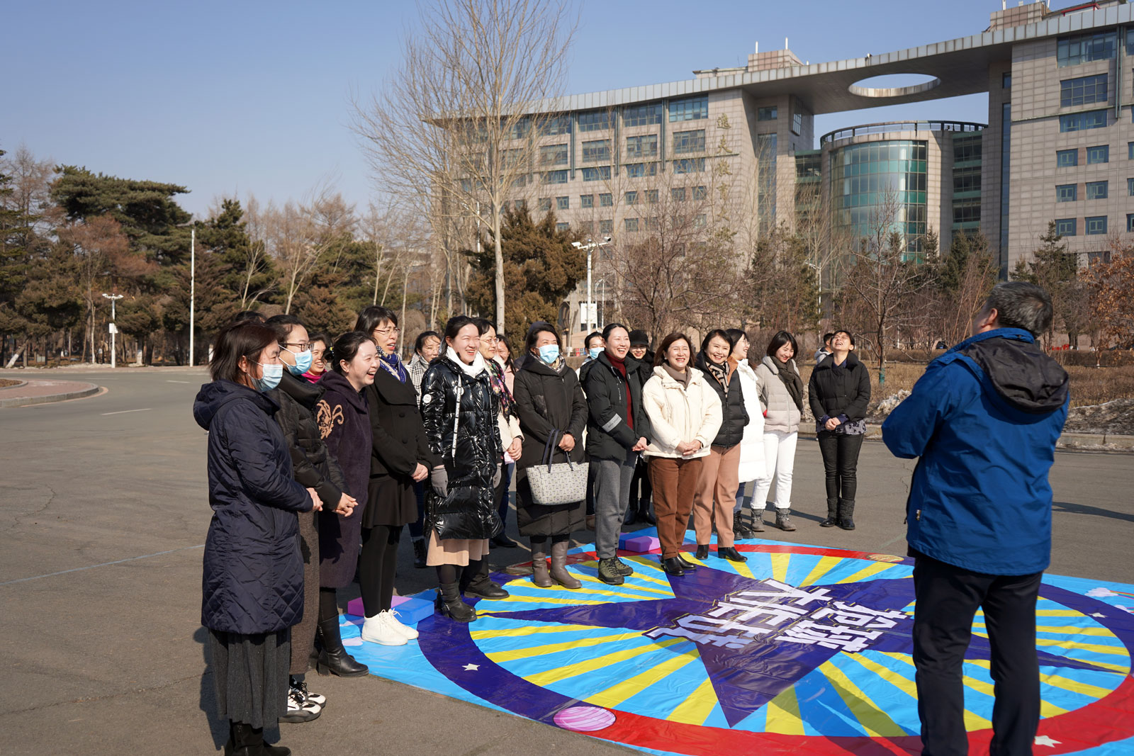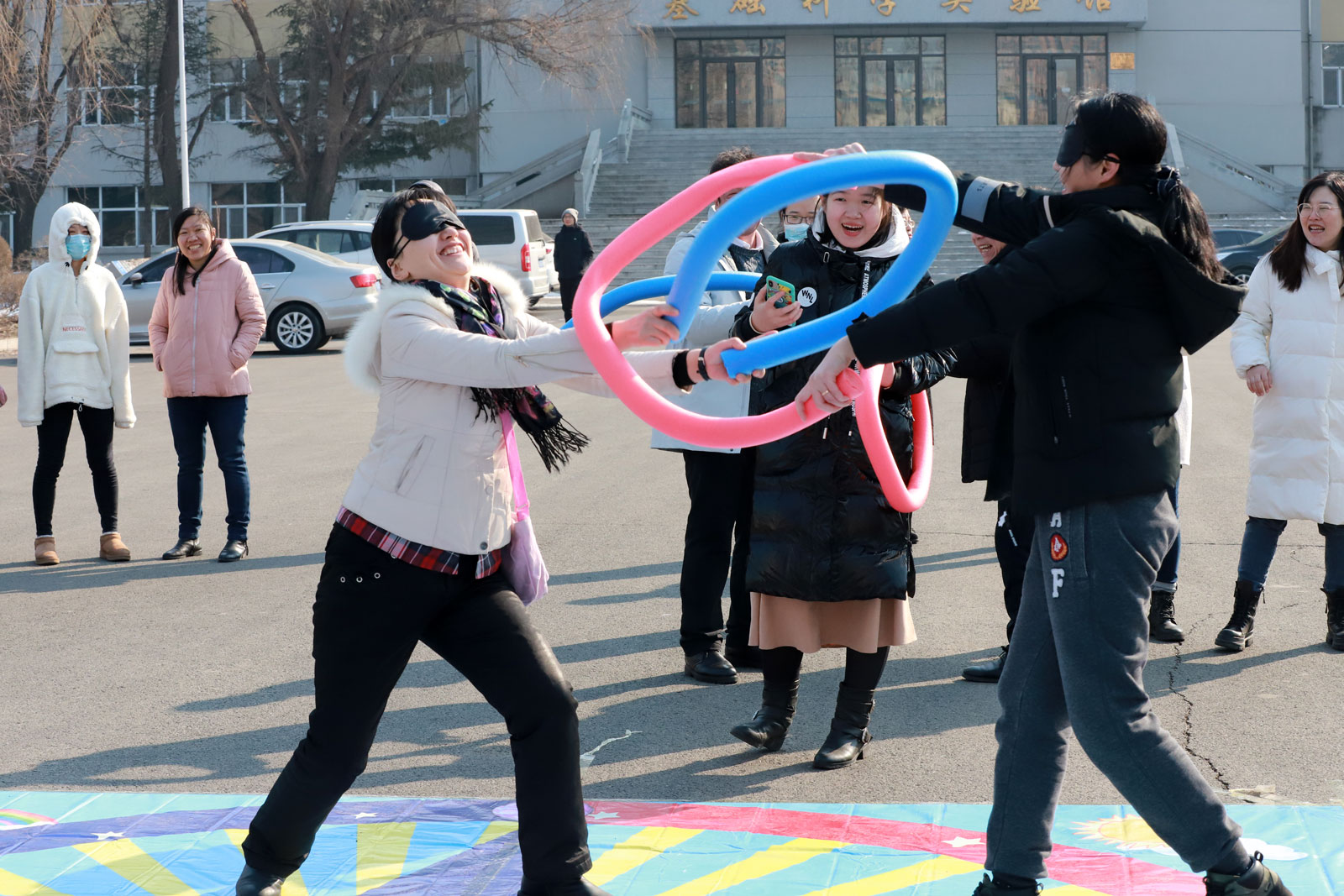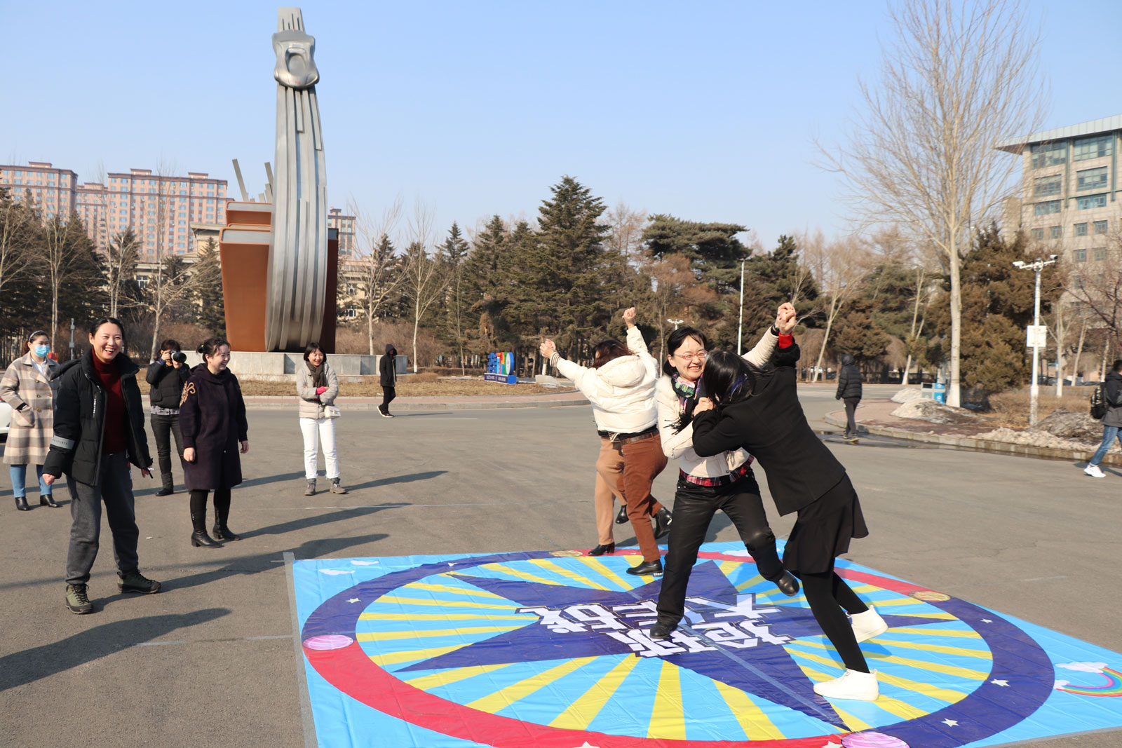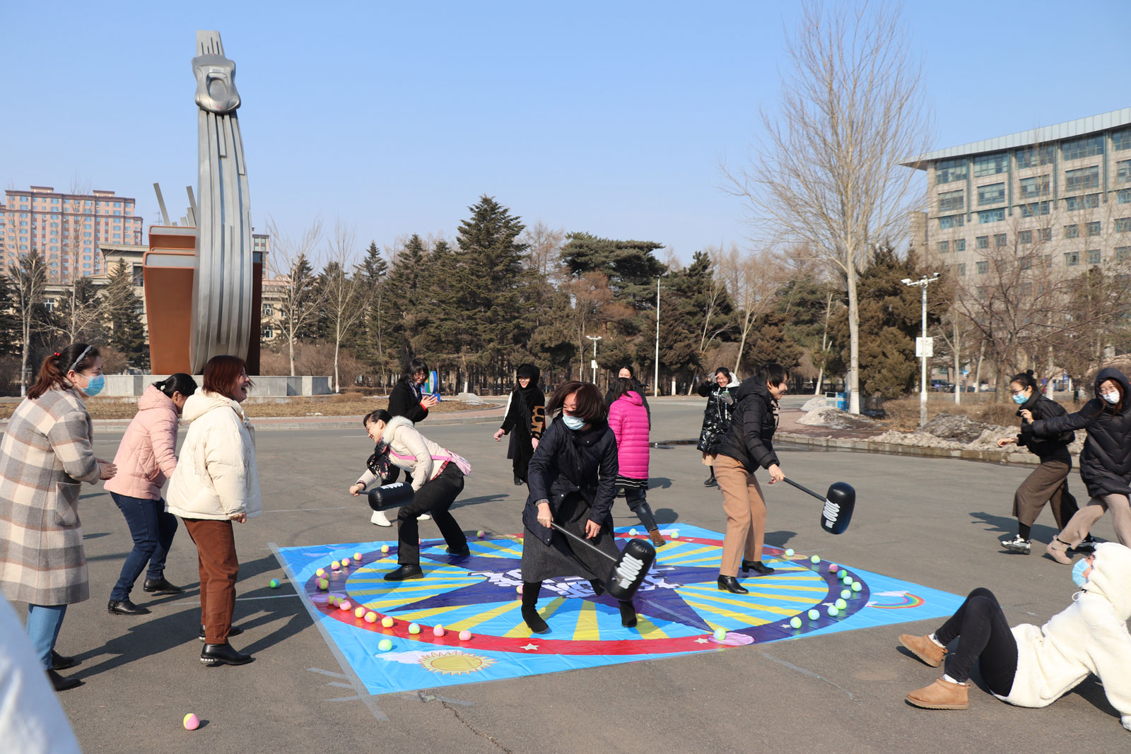 之后,现场女老师们分成两拨,并抽签确定了队名“女神队”“女汉子队”,依次进行了紧张有序的趣味运动会环节:摸石过河、同心击鼓、开心打地鼠、蒙眼互打。在欢闹的气氛中,不仅体现并增强了老师们之间的团队合作能力和顽强拼搏的精神,更加展现了大家的热情洋溢和积极进取的精神风貌,并引来路人驻足和叫好。
