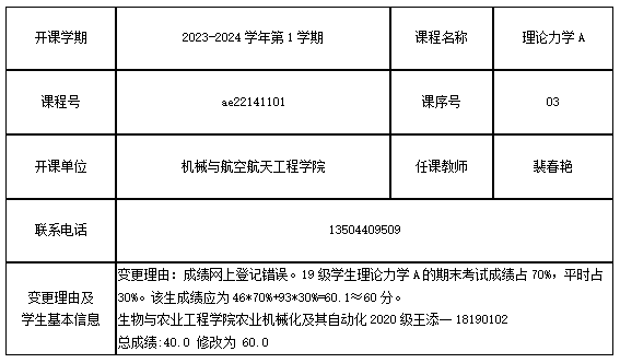 关于生物与农业工程学院2020级王添一同学理论力学A课程成绩更正的公示